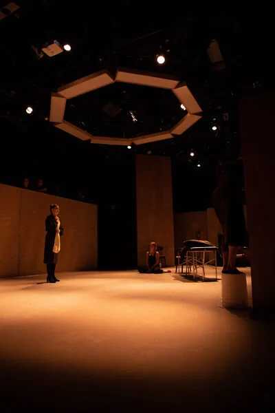 Description: During my second year in graduate school, I worked as the Technical Director for the theater schools production of Hedda Gabler. The set was constructed using both steel deck and custom built platforms, and birch plywood walls in order to create “stadium like” seating. We also fabricated steel hand rails for audience safety, and a large monolith that was projected on.